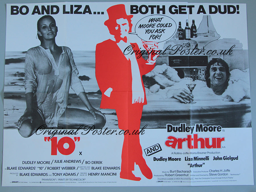 This is the specially designed 1981 British quad double-bill film poster for the two films starring Dudley Moore "10" and "Arthur". The artwork pictures the star with champagne glass in hand flushed by his success as the self made millionaire. Bo Derek is pictured and Liza Minnelli gets a mention too. Not many of us have a stereo system with a cassette player plus a drinks cabinet and a yacht by our bath - "What Moore could you ask for!".