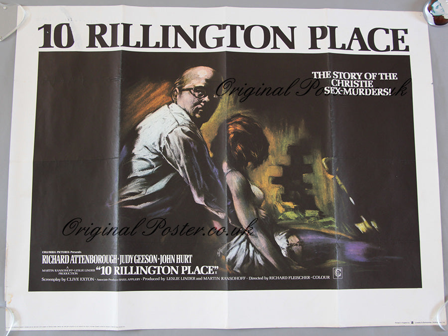 Original British quad picturing Richard Attenborough as John Reginald Christie with X certificate artwork printed by Lonsdale & Bartholomew (Nottingham). Please note this poster has paper lift to the right of "10" in the title and slight bleed at the top right where the title has been written in black felt on the reverse.