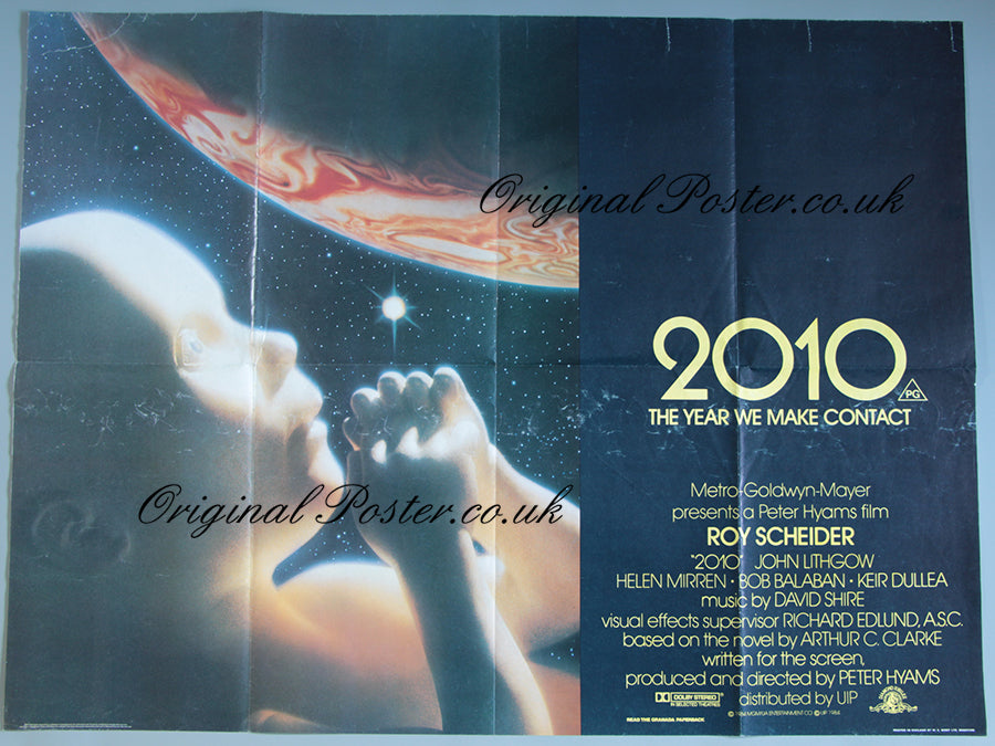 This is the Metro-Goldwyn-Mayer science fiction film "2010 The Year we make Contact" film poster from 1984. Printed in England by W. E. Berry Ltd. of Bradford. The film starred Roy Scheider, Helen Mirren and Keir Dullea featuring a powerful intergalactic image. There are four closed tears at the top of the poster and stress marks horizontally as seen. The poster is priced accordingly.