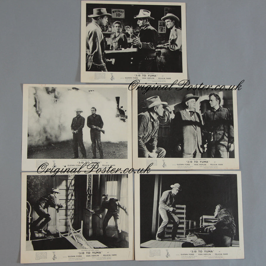 Five original black and white lobby cards from 1957 for "3:10 to Yuma". Printed in England by Waterlow & Sons Ltd. Many regard this film as amongst the best Westerns. Glenn Ford is amazing as the baddie guy while Felicia Farr is well at home in the bar where whiskey sells for 10 cents according to the sign.