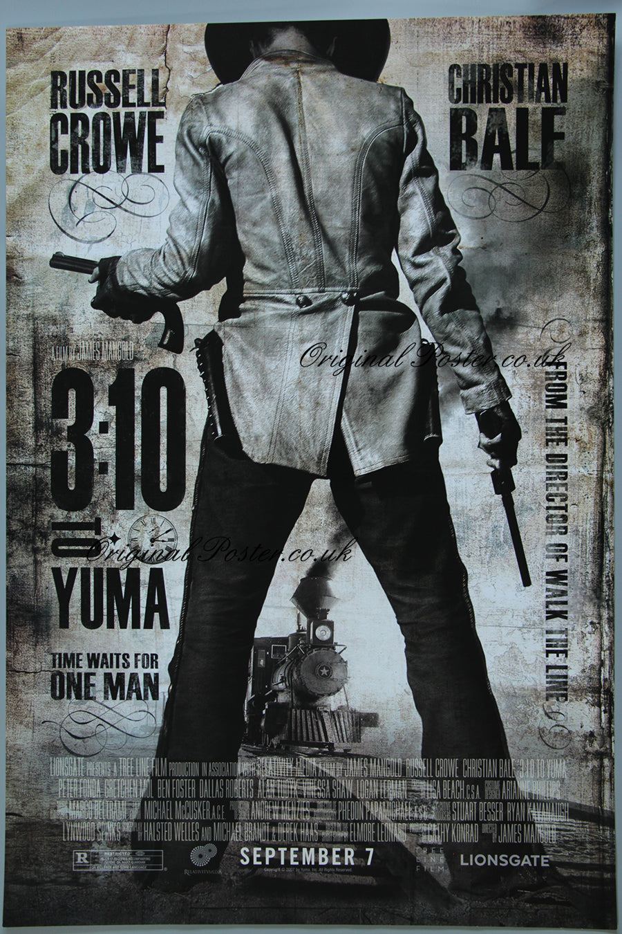 Terrific Rolled condition cinema poster for "3:10 to Yuma" picturing the train steaming on the tracks with the gunslinger and the clock all pictured. Directed by James Mangold of "Walk the Line". This is a classy image.