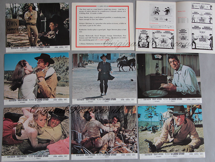 Set of eight cinema lobby cards including a glossy synopsis card of the Henry Hathaway technicolor western and an 8 page campaign guide for the film starring Dean Martin and Robert Mitchum with illustrated Quad poster design and cinema stills, photos from the film and press ad blocks.