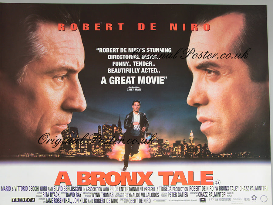 Robert De Niro's directorial debut came in 1993 with this film "A Bronx Tale". He is pictured here in the star role in this rolled condition film poster with the backdrop of New York's little Italy where he plays the role of a bus driver whose young son is influenced by a sharp dressing local gangster.