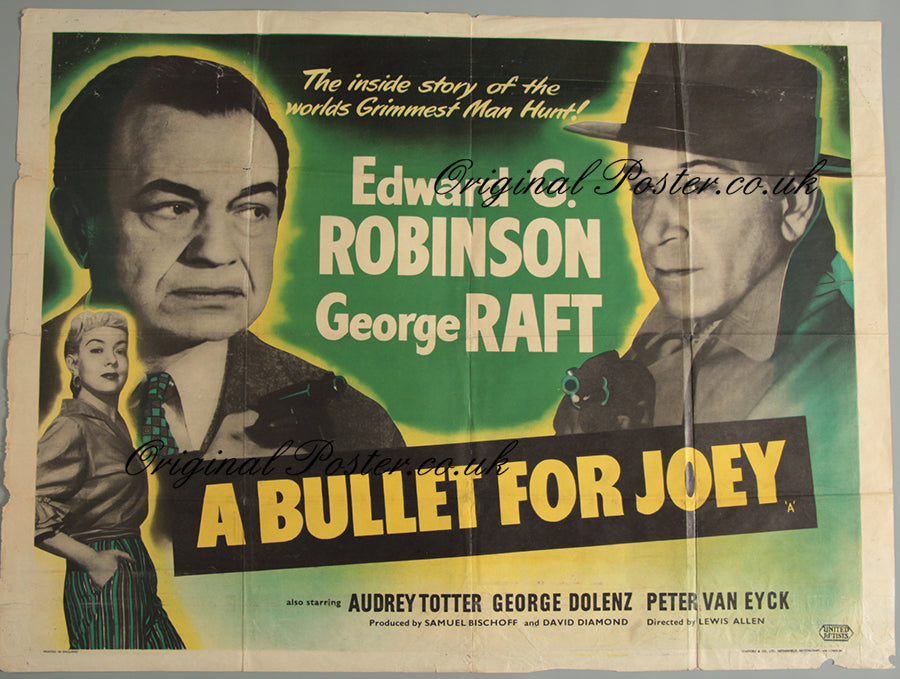 Super first release 1955 Edward G. Robinson British quad film poster. Edward G. Robinson plays the police inspector and George Raft pictured beside him plays the gangster. This film poster has a great gangster / spy look to it with interesting colours for what was of course a black and white film. Printed in England by Stafford & Co of Netherfield, Nottingham & London this one was released by United Artists and is a rare find. A great film poster with the look that Edward G. Robinson fans just love. Small areas of paper-loss in the borders, multiple pinholes in corners, we have applied a few areas of acid free conservation tape to a few tears on the reverse.