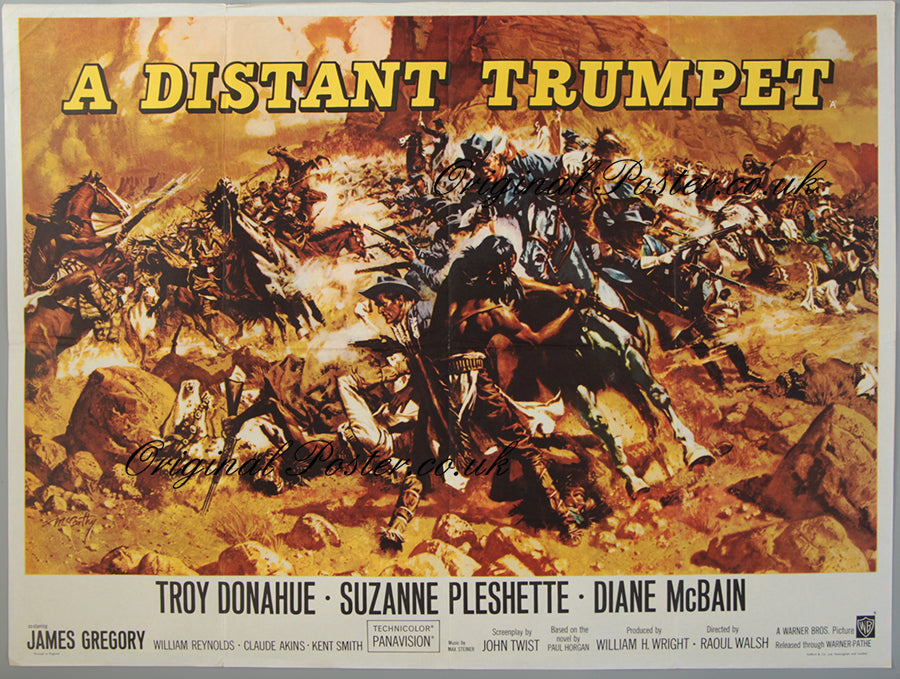 Superb cavalry western artwork complete with Indians in a fierce battle scene as painted by artist Frank McCarthy whose printed signature can be found at the lower left of the painting. Distinguished director Raoul Walsh respects the dignity of the Indians and the film even includes native language and subtitles. Printed by Stafford & Co. of Nottingham and London this folded film poster from 1964 for "A Distant Trumpet" displays really well and does not even have any pinholes. Red biro on reverse that does not show through to front, a matchstick head size hole on the centre fold.