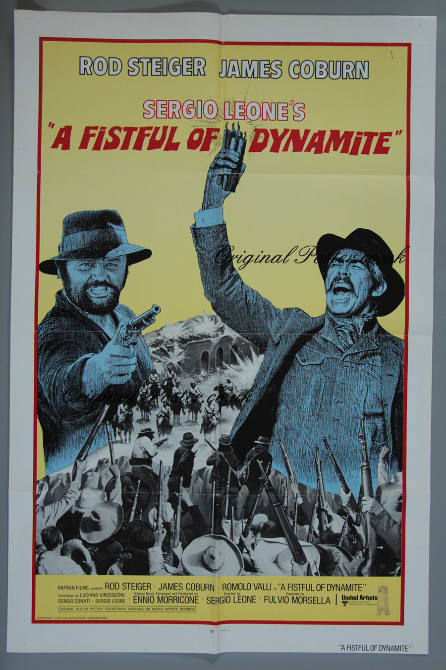 First release 1972 litho printed US one sheet for "A Fistful of Dynamite" picturing James Coburn as an explosives expert and walking arsenal together with Rod Steiger with pictures of the Mexican Revolutionary Army. This is the International release poster purchased directly by us from a New Zealand cinema.