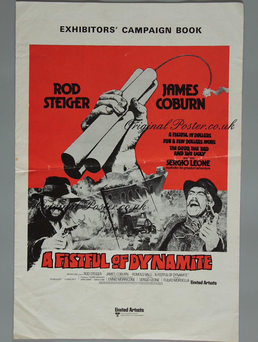 This United Artists exhibitors campaign book comprises six pages on the first release of the Sergio Leone directed film "A Fistful of Dynamite". Great explosive excitement blow-ups for front of house displays together with many ad blocks, editorial with great and unusual photos.