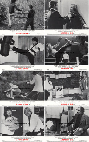 Full lobby card set of 8 lobby cards with 4 cards featuring Chuck Norris the six times world karate champion. Pinholes in corners.
