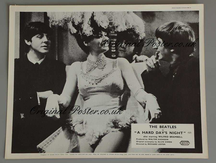 Surviving from 1964 is this front of house cinema lobby card for the first Beatles film made in black and white and picturing Paul McCartney, John Lennon and Ringo Starr. Printed in England by Waterlow and Sons ltd this was a groundbreaking film for the music era with direction by Richard Lester. No pinholes but there is a small indentation puncture on Anna Quayle as Millie's arm.