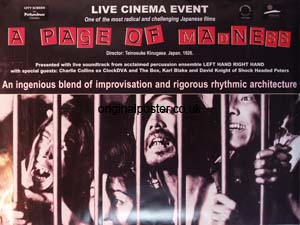 Rolled UK cinema quad for the rare cinema showng of the 1926 black and white Japanese film released with a music soundtrack telling how an elderley man working in a mental hospital where his wife is confined seeking to release her. The film contains flashbacks to happier pre-asylum times and explores a wide range of cinematic techniques revolutionary in 1926.
