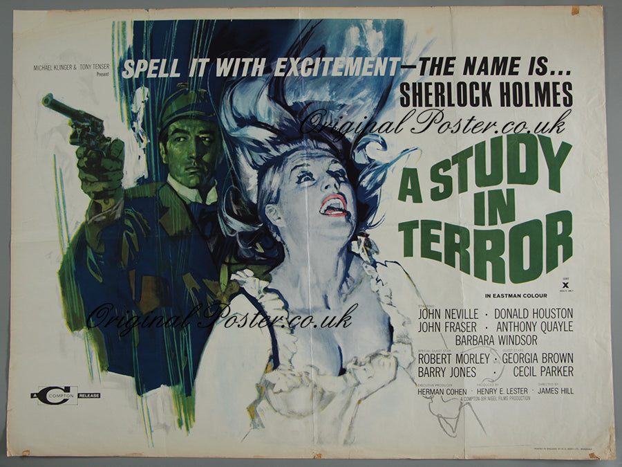 Powerful artwork for this "X" certificate adults only British quad film poster complete with the Compton release logo. Sherlock Holmes is complete with deer stalker, cloak and revolver and the whole swirly 1965 artwork is really impressive. Printed in England by W. E. Berry of Bradford and presented by Michael Klinger and Tony Tenser. This first release British quad film poster has a corner tip replacement at the top left and a few closed border tears which we have repaired with conservation tape to the reverse. A few small historic tape marks in the borders as seen.
