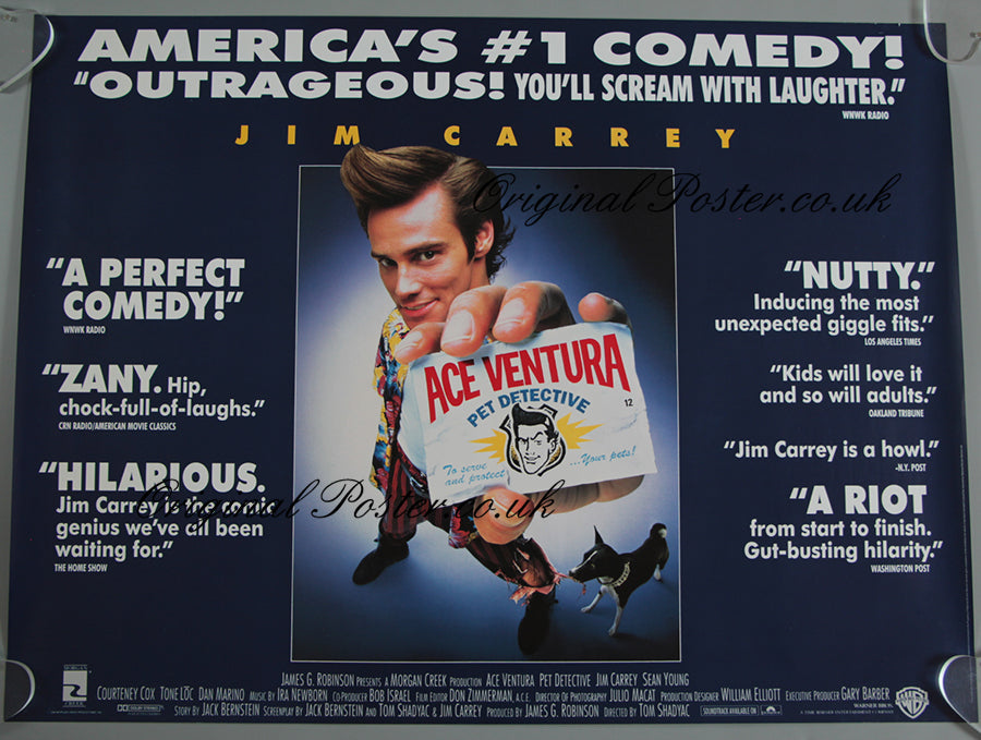 This 1993 rolled film poster for "Ace Ventura Pet Detective" propelled Jim Carrey into instant comedy stardom. Pictured here with outrageous hair style Hawaiian shirt and stripy pants he is a private detective here serving and protecting pets.