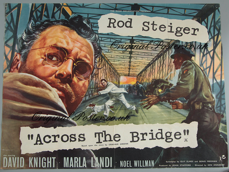 This is the first release 1957 British quad film poster for the Rank film "Across the Bridge". The film was based on the story by Graham Greene and directed by Ken Annakin. The finely detailed artwork is really colourful with a high degree of perspective and detail portraying the events on the bridge. Film posters printed to the edge without a border were always more expensive to produce. This folded condition British quad has excellent colours with no fading and a small matchstick head size hole at the centre fold on the left together with a few small closed tears at the bottom which have been repaired with conservation tape. There is a little stress on the left hand side of the fold line across Rod Steiger's shoulder.