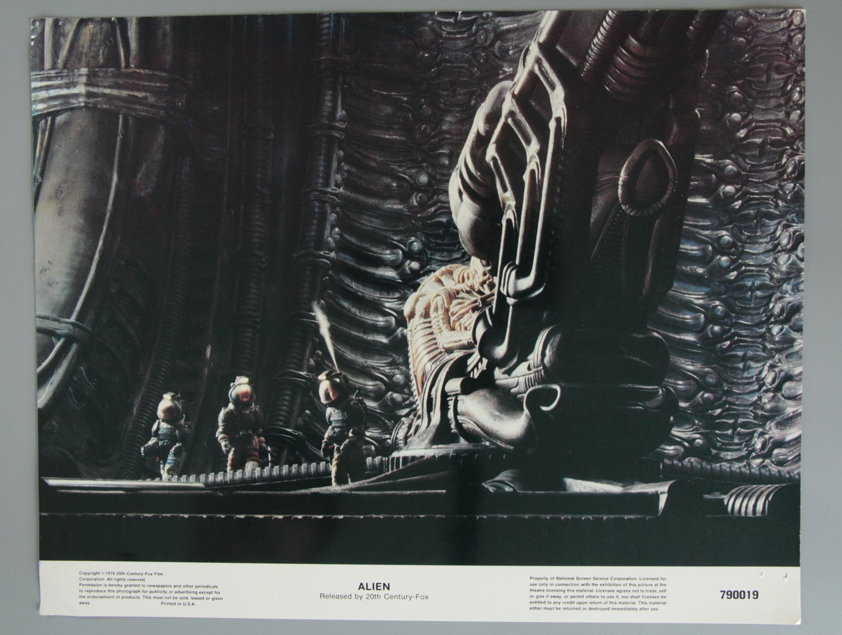 This is an original large 1979 cinema front of house lobby card released by 20th Century Fox for the Science fiction horror thriller "Alien". Pictured on this large card in full colour is the imaginative bio-mechanical production design set for the Alien created by Swiss artist H. R. Giger. Great card for this cult sci-fi movie with pinholes in the corners.
