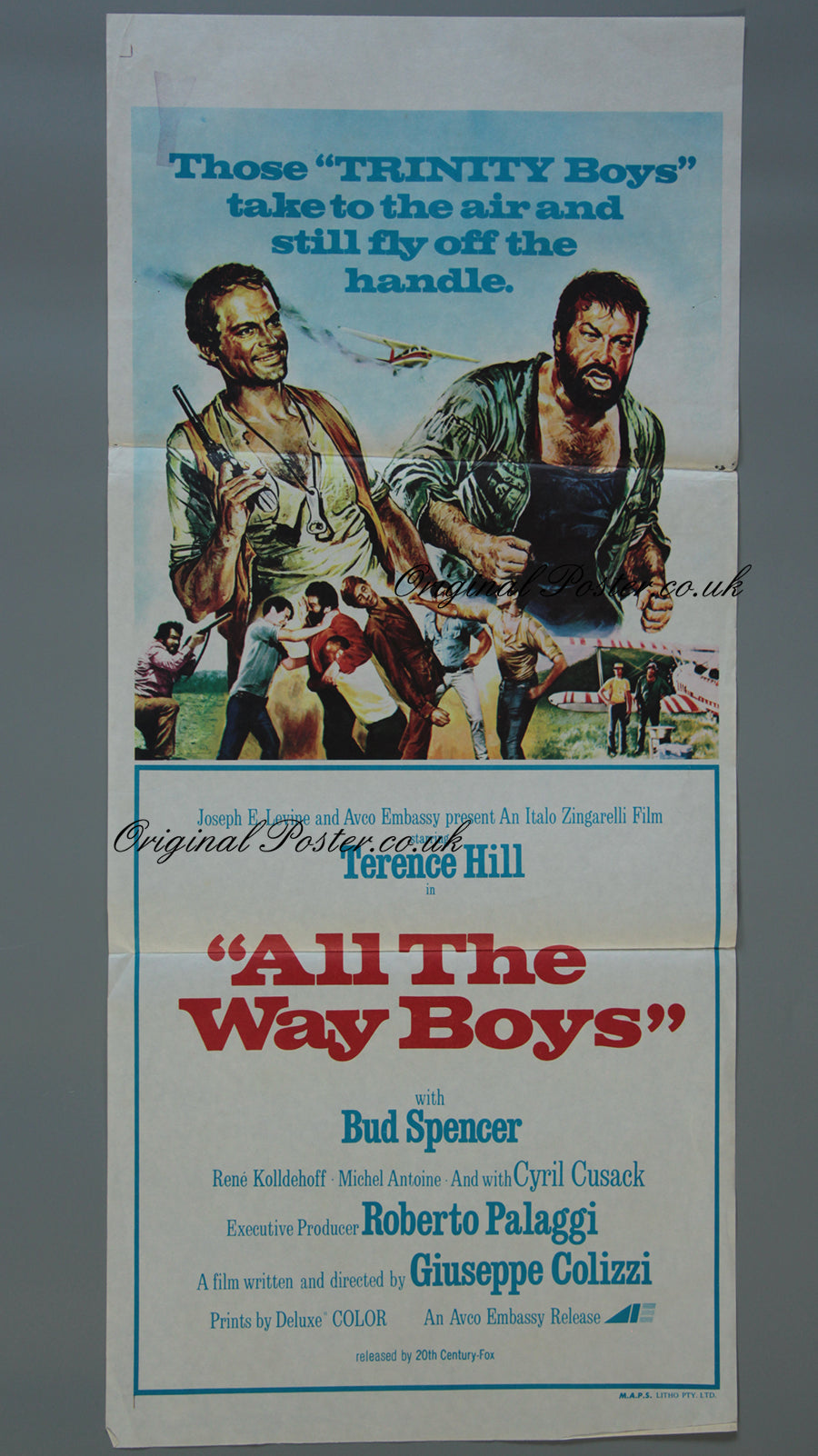 Terence Hill and Bud Spencer are pictured in fine form here complete with clenched fists ready for fighting, guns and even a handy bottle opener! This terrific duo have provided much entertainment over the years and are ready for more in this litho printed Australian day-bill film poster which we acquired directly from A New Zealand cinema. Fold lines as issued to the cinema with the tiniest imperfection on the top right edge fold line as seen. No pinholes.