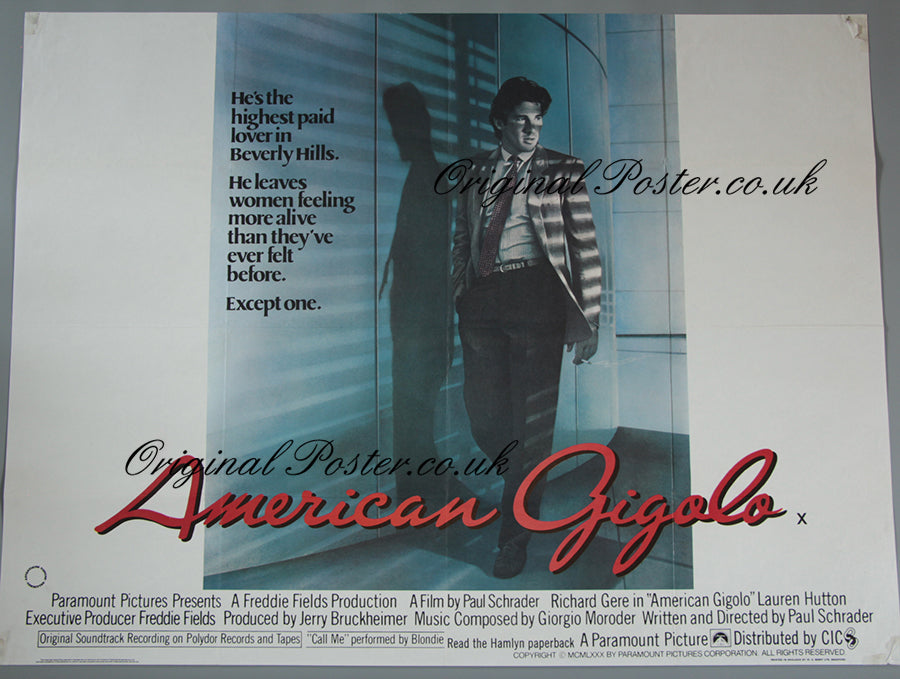 Richard Gere is the Beverley Hills gigolo whose fashion sense and ability to please bored housewives becomes his meal ticket. This film made Richard Gere a big star - this being the original first release quad. Sellotape in all four corners as seen.