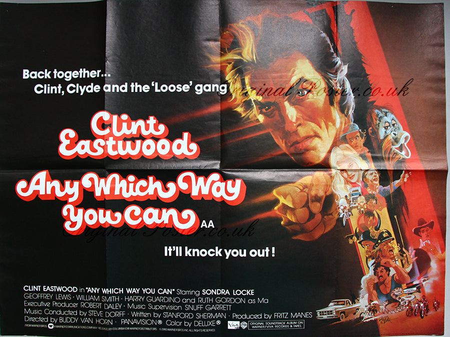Directed by Buddy Van Hom this is the sequel to Every Which Way But Loose. Fine Clint Eastwood portrait on this original British quad cinema poster with the printed signature of the artist Bob Peak on the poster.