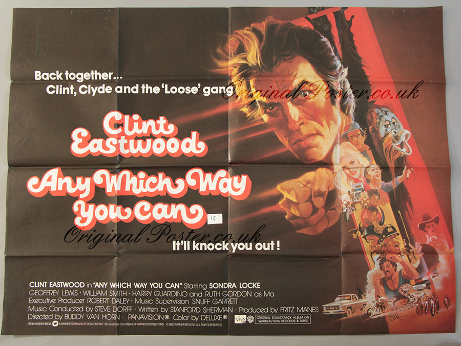 Great film poster artwork by famous American artist Bob Peak picturing Clint Eastwood together with Clyde the gorilla, Sondra Locke his girlfriend, grandma and the Hell's Angels group together with bikes. This film was so popular that it was shown again and again with this particular film poster having been used years later (there is a 15 cert over the original AA)