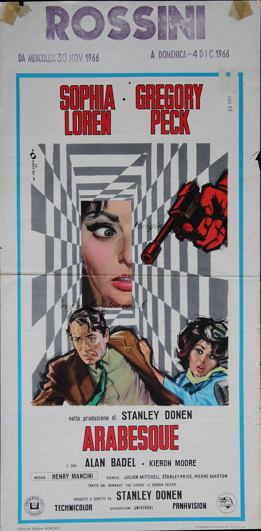 Cesselon artwork with printed signature with clever use of perspective drawing the eye to the anxious face of the beautiful Sophia Loren. This eye-catching Italian film poster dates from 1966. Prince by "Lito . P. Ragioni Roma Via Prenestina 738 Printed in Italy." Has the benefit of the cinema details at the top of the poster "Rossini" together with the show date of 30th November 1966. The film poster has extremely bright colours with small border nicks and two historic tape marks at the top.