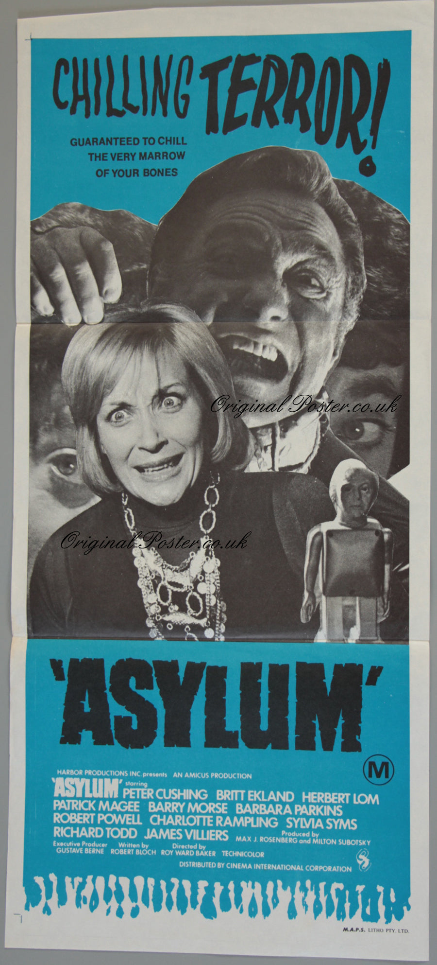 Amicus horror film poster from 1972 with each story being a mental patients case history building to a grand final twist with a very clever script, black humour and a terrific all-star cast including Peter Cushing, Britt Ekland, Herbert Los, Patrick Magee, Charlotte Rampling, Sylvia Sims, and Richard Todd, Printed by M.A.P.S. and purchased by us direct from a New Zealand cinema. Folded with no pinholes.