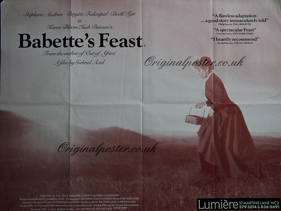 This is the superb British quad film poster printed for the Lumiere Cinema in London for the 1987 showing of the highly acclaimed Danish film "Babette's Feast" and winner of 'Best Foreign Film' Oscar. The picture and clothing depicts life in the Jutland peninsular in the 1870's with Babette played by French star Stéphane Audran seeking refuge from war torn Paris. A classy Artificial Eye release.