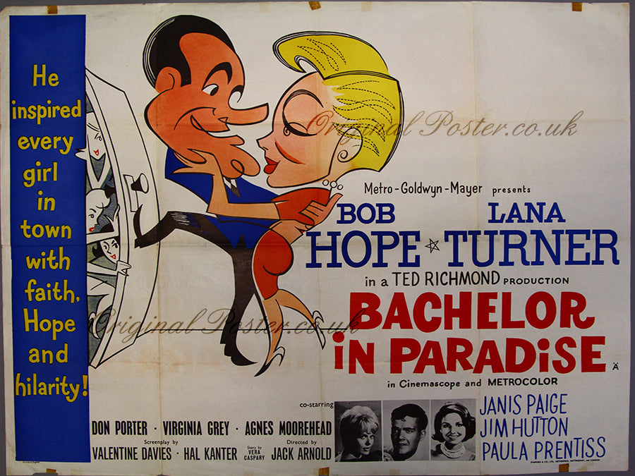 Impressive artwork of Bob Hope together with Lana Turner - very American and here in landscape format on the British Quad printed by Stafford & Co. of Netherfield Nottingham & London. This film poster dates from 1961 and has small tape marks in the top and bottom border.