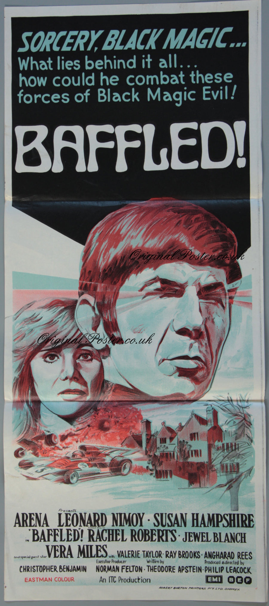 First release 1973 Australian day-bill film poster for the film "Baffled!". Leonard Nimoy and Susan Hampshire are pictured in this ESP black magic sorcery film featuring as pictured an English country hotel and racing cars to add to the mystery. Printed by Robert Burton Printers of Sydney. This one came to us directly from a cinema in New Zealand. Very slight wear to the top left fold line and a 1/2 inch closed tear which we have repaired to the reverse with archival tape.