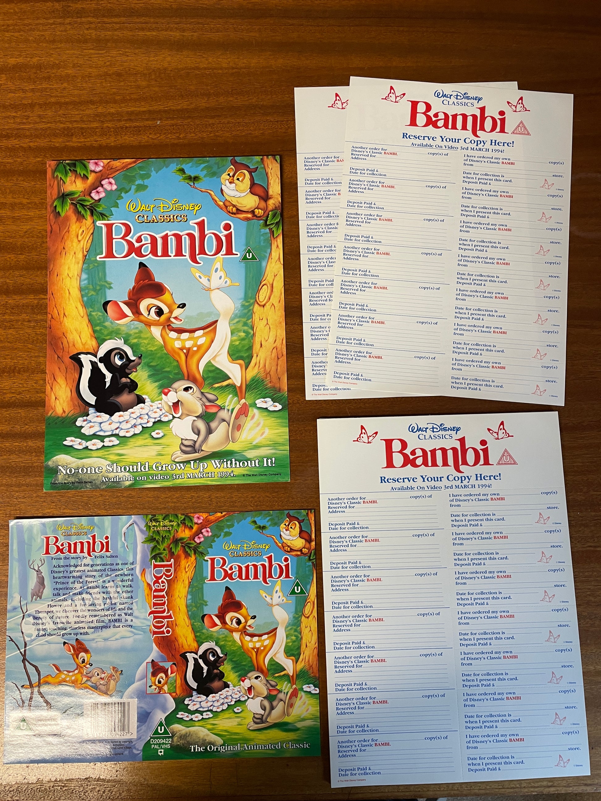 Interesting unused Walt Disney retailer pack for the sale of the film "Bambi" on video 3rd March 1994. Included are two full colour sample video sleeves for the film, a colour advertising portrait taken from the front cover and a pad of 25 video reservation sheets enabling the video retailer to take deposits for his customers and issue a receipt. A great piece of video history for a very popular film.
