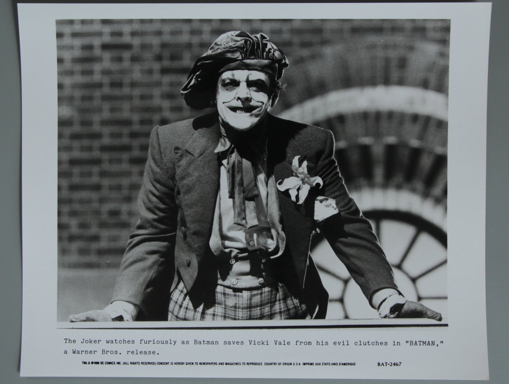 "Batman" original first release front of house cinema lobby card from a Devon cinema in 1989 and picturing Jack Nicholson as the Joker together with a printed synopsis at the foot. Terrific glossy card as issued to the cinema in excellent condition and with no pinholes.
