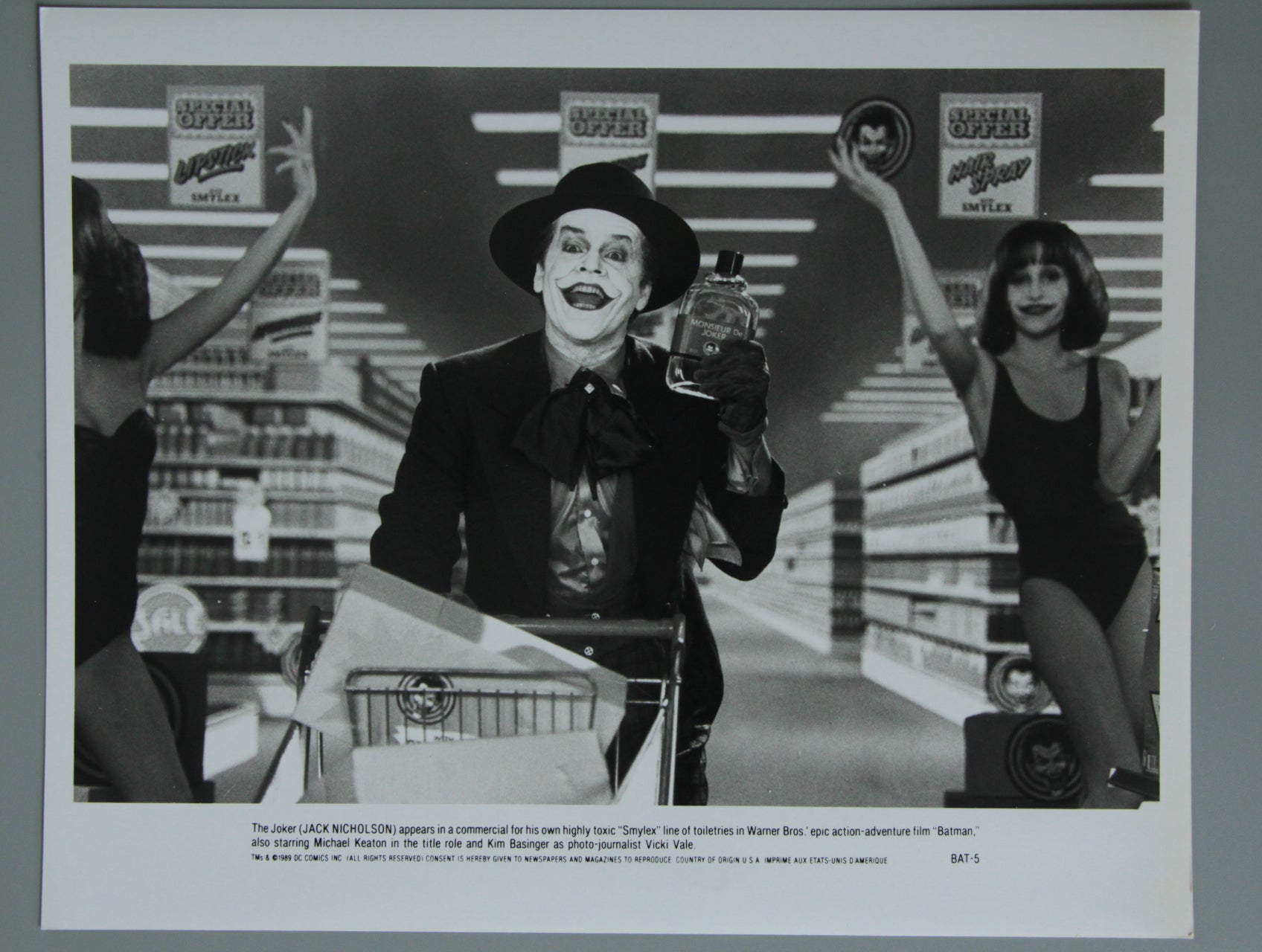 "Batman" original first release front of house cinema lobby card from a Devon cinema in 1989 and picturing Jack Nicholson as The Joker in the 1989 film "Batman" starring in his commercial for his highly toxic "Smylex" range of toiletries. There is a printed synopsis at the foot of the card. Terrific glossy card as issued to the cinema in excellent condition and with no pinholes.