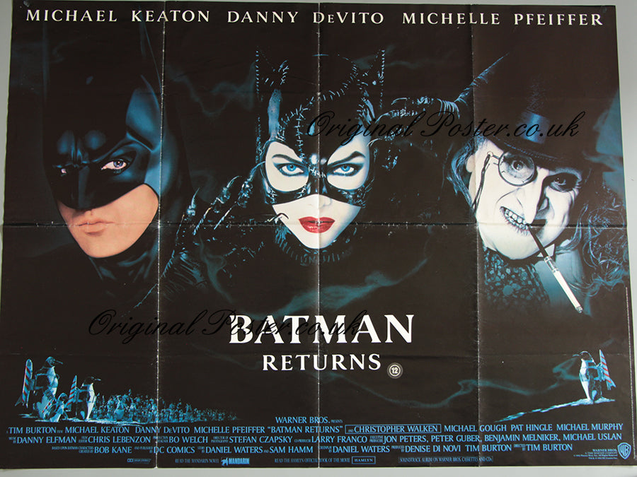 This is the folded British quad cinema poster from 1992 for the film "Batman Returns". Picturing Batman, Catwoman and the Penguin. This folded film poster has fold wear as seen with no pinholes.