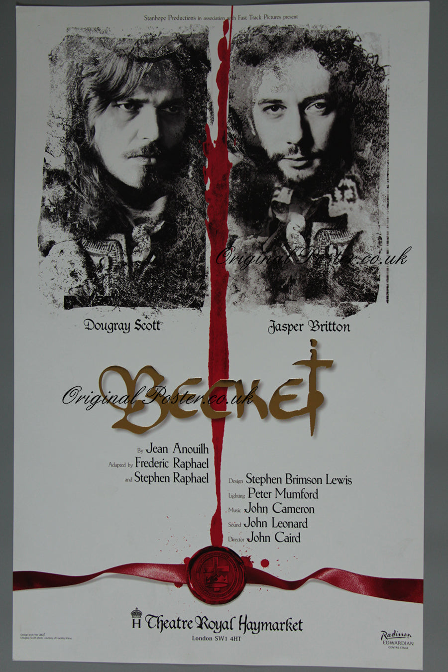 Original Theatre Royal Haymarket playbill poster for "Becket" featuring photo illustrations of Dougray Scott and Jasper Britton. Excellent rolled condition.