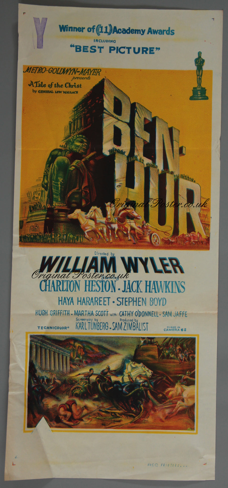 An epic film poster featuring stone litho printing with the most gorgeous colours by A & C Printers. This film cost more to make in 1959 than any other film and it won a record amount of eleven Oscars - a true epic with 8,000 extras for the twenty minute chariot race which features prominently on the film poster. Purchased directly from us from a cinema in New Zealand this one has no pinholes.