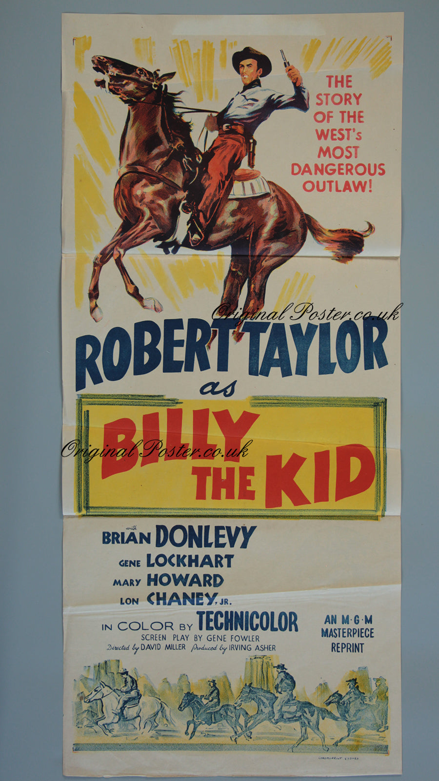 Robert Taylor is pictured magnificently riding on horseback as the most dangerous outlaw from the wild west "Billy the Kid", This lovely old stone litho film poster was purchased by us directly from a New Zealand cinema and comes folded with no pinholes. We believe this is an early MGM masterpiece reprint and the printers details are at the foot "Chromoprint, Sydney"