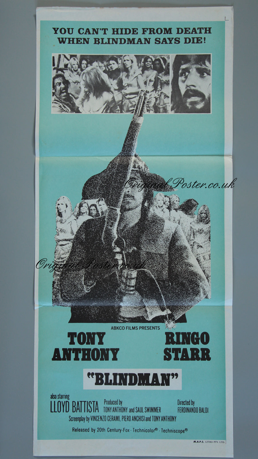 This 1971 film poster for the film "Blindman" tells the story of the blind gunfighter whose job it is to rescue fifty mail-order brides from the bandits in Mexico. Ringo Starr is in the role of Candy and the poster is litho printed by M.A.P.S. and in folded condition as issued to the cinema with no pinholes.