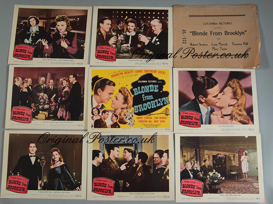 Full set of eight cinema front of house lobby cards released at a time in 1945 when the world was a happier place at the end of the second World War. "Blonde From Brooklyn" was a happy Columbia Pictures film telling the story of two lovers who unexpectedly became famous singers. The set even includes the title card and each great scene from the film has an individual description underneath. The set even has the original 1945 Columbia Pictures wrapper.