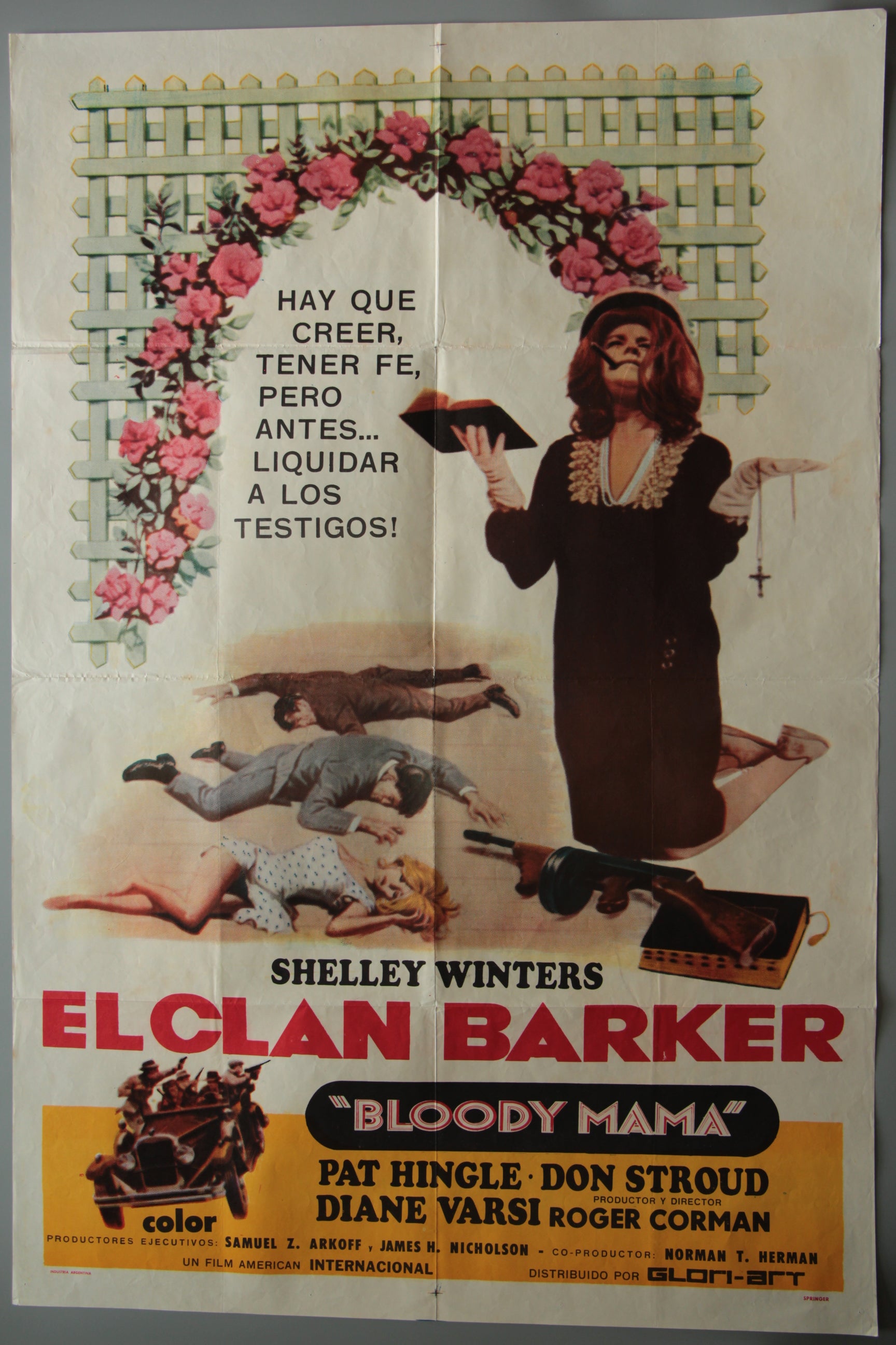 This first release Argentinean film poster from 1970 stars Robert DeNiro as Lloyd Barker the drug addicted son in Roger Corman's true crime story. Pictured is Shelley Winters as the bank robber who terrorised the American mid-west in the 1930's. The film features an early appearance from Robert DeNiro and "Bloody Mama" Roger Corman ensures has copious amounts of blood. Printed by Springer, its got two small areas of conservation tape on the reverse at the fold lines.