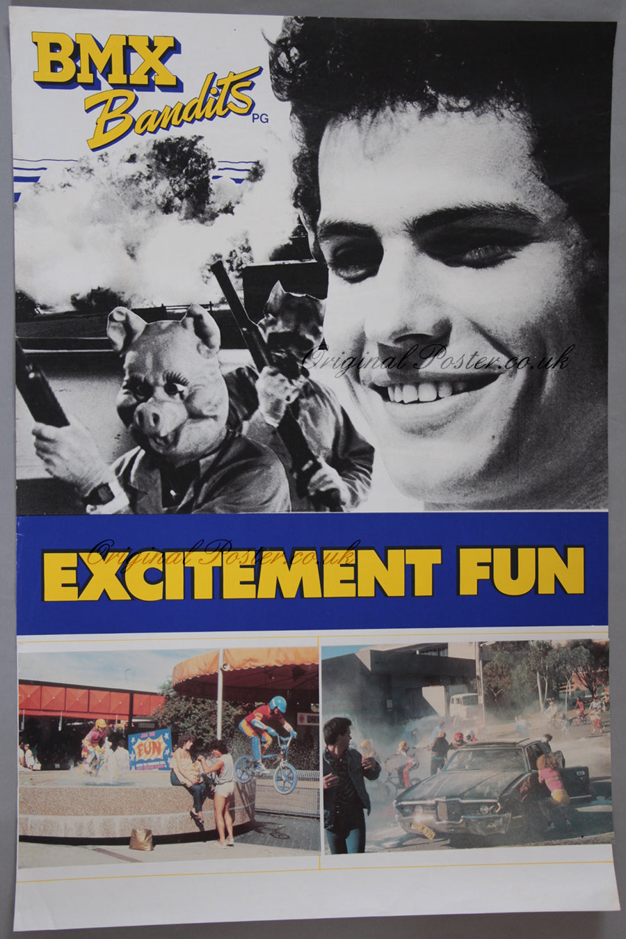This 1983 double crown film poster was designed with two lobby cards from the film depicting action scenes as the BMX bandits foil the gang of crooks rolled condition with some marks on the back that do not show through to the front. A young Nicole Kidman is pictured in both the lobby cards as Judy.