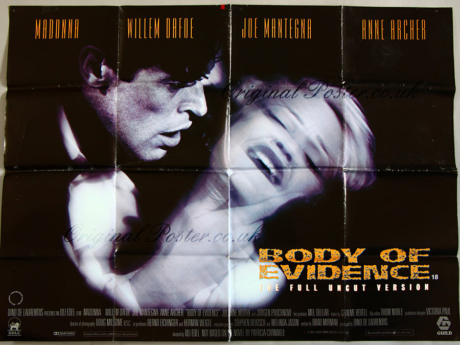This folded double-sided British quad film poster from 1992 pictures Madonna as the Femme Fatale who we are led to believe has murdered her rich elderly boyfriend.