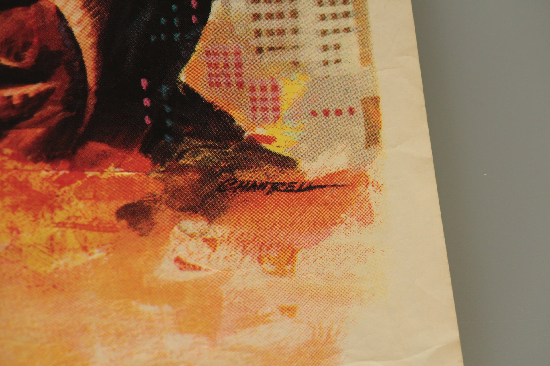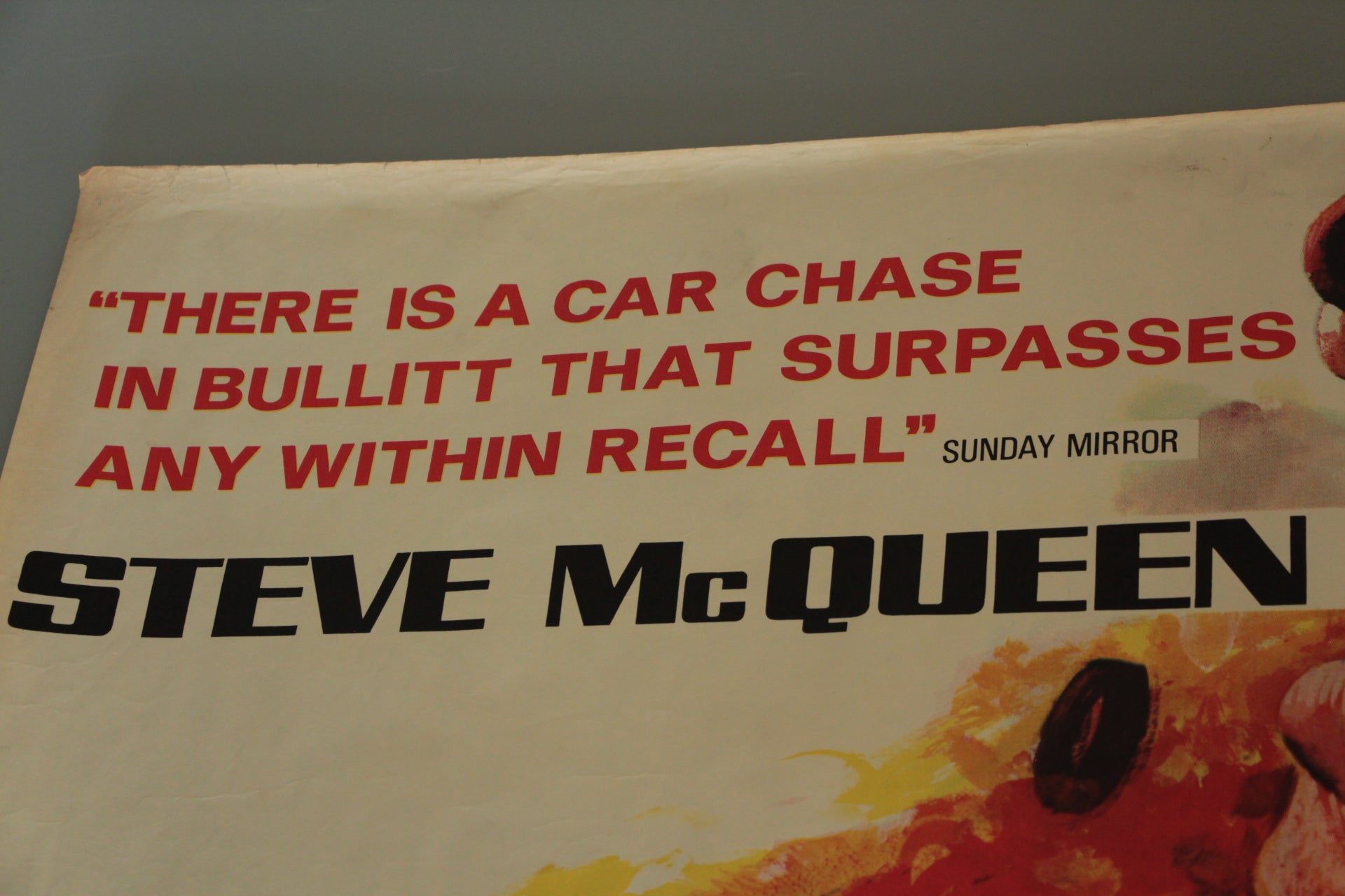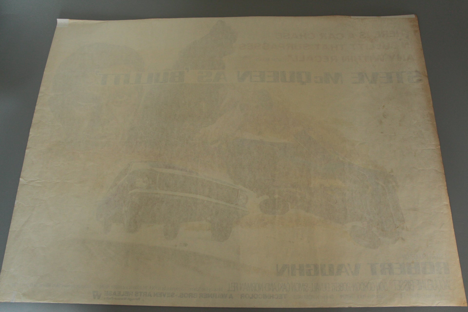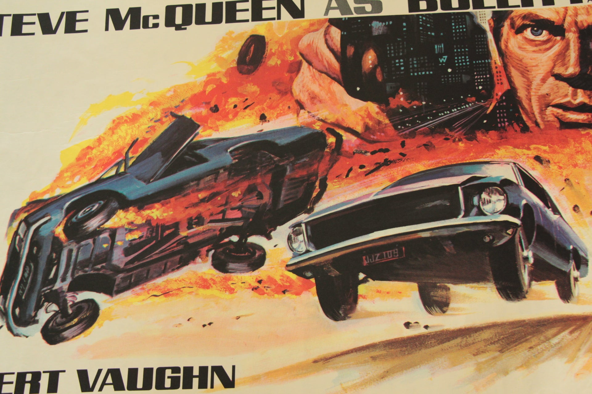 Extremely rare rolled condition style 'B' British quad film poster from the first release in 1968 of the film "Bullitt". The printed signature of the artist Chantrell can be seen just under the amazing swirling artwork of Steve McQueen as the maverick cop assigned to protect a key government witness about to testify about a crime syndicate. This rare film poster art emphasises the explosive San Francisco urban car chase scene and is available here with very bright colours and no restoration. Two pinholes in the right top corner with one in each of the others. A few very small nicks in the top border and a 3/4 inch closed tear at the bottom right corner which we have applied very small pieces of conservation tape to at the reverse of the poster. Extremely rare to see a rolled condition poster of this film - this is the first we have ever seen.
