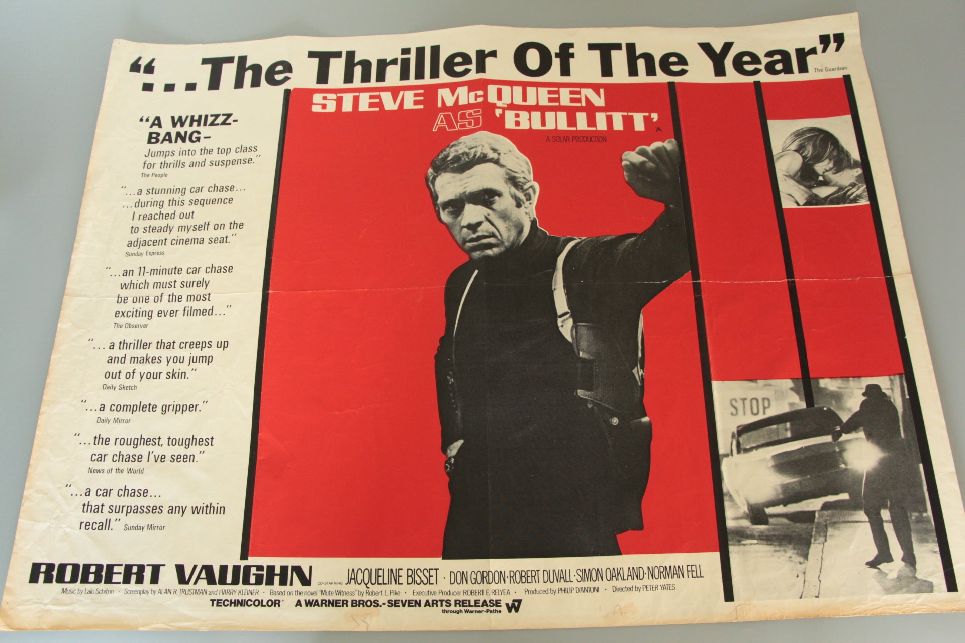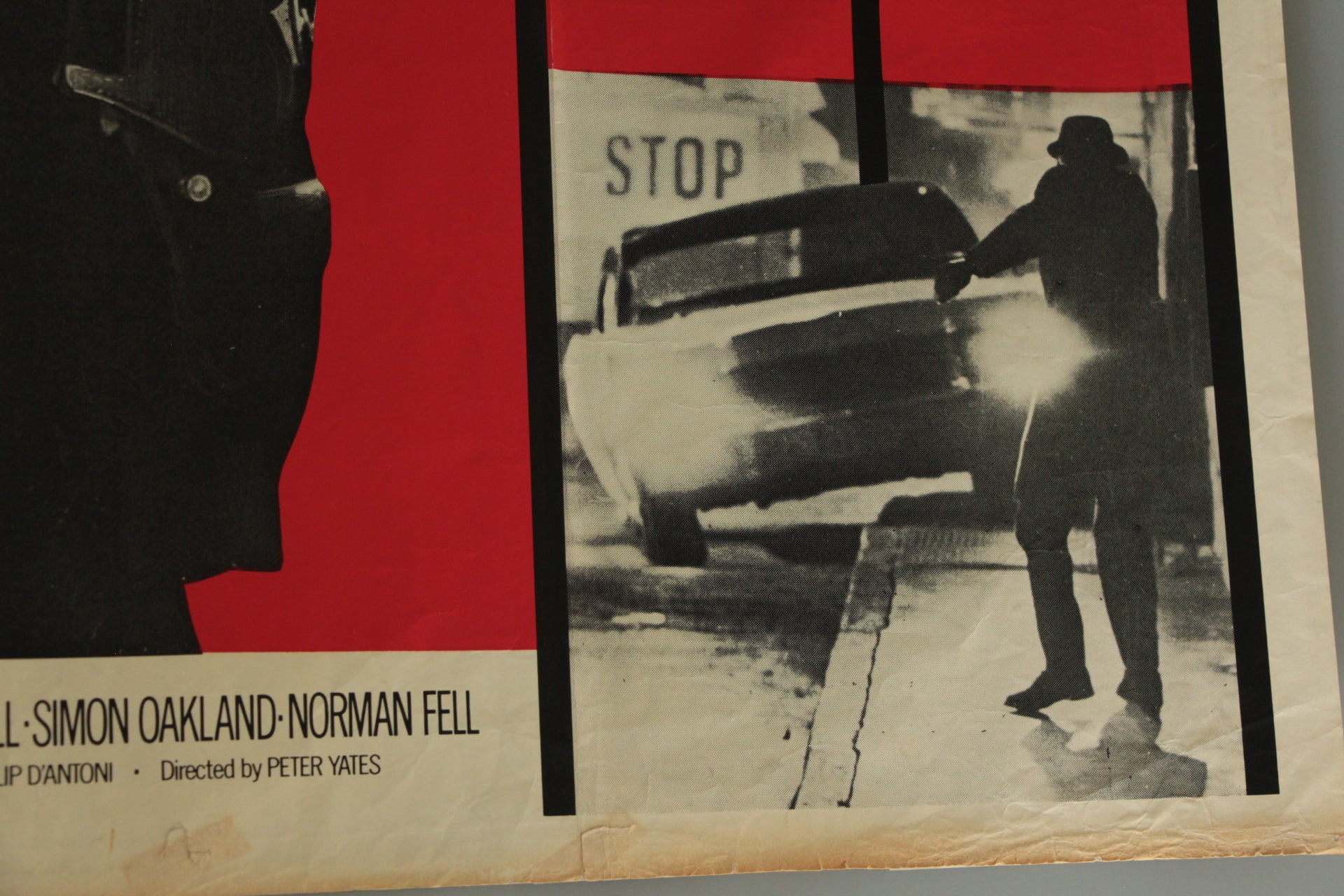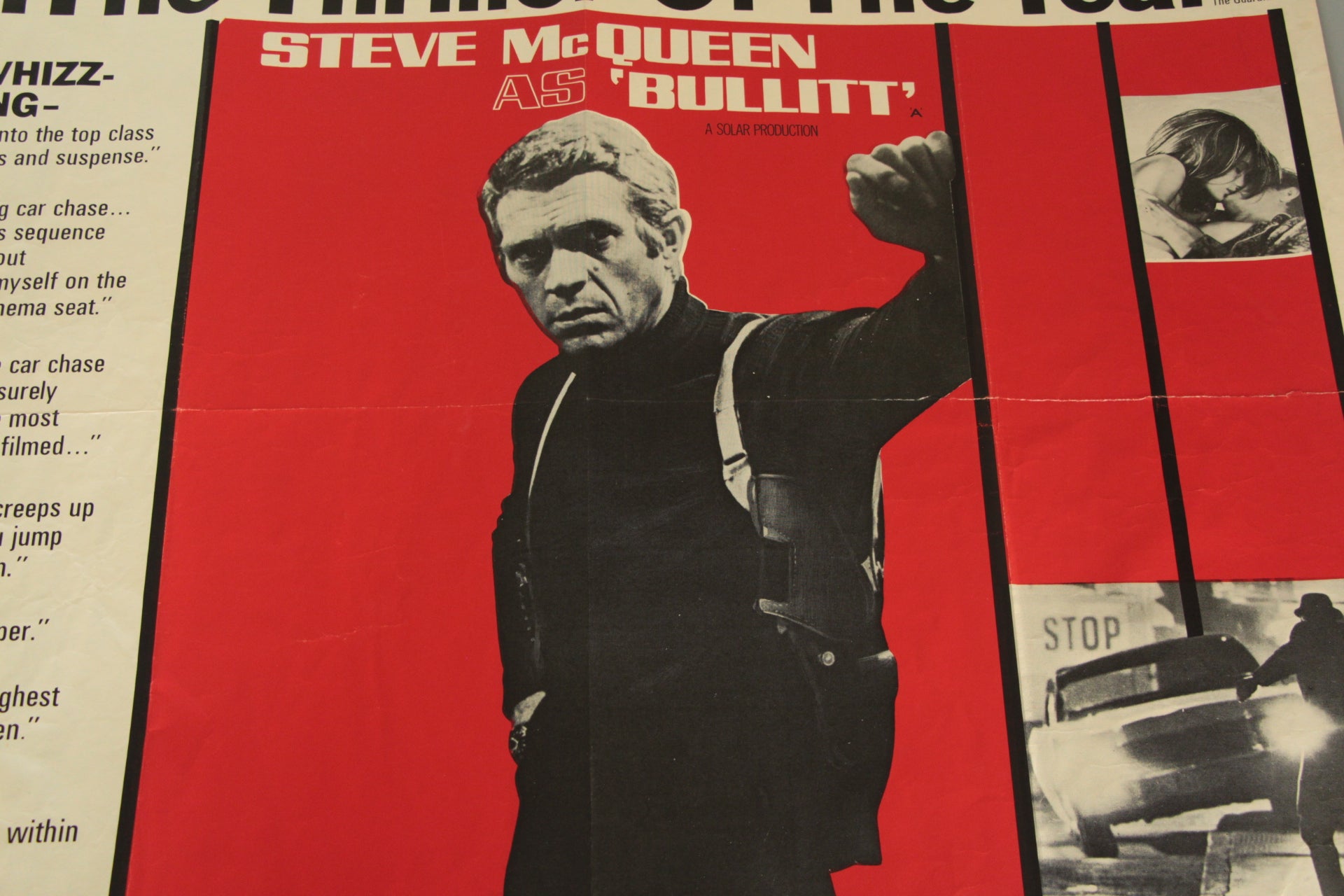 Extremely rare British quad film poster from the first release in 1968. Steve McQueen is pictured centrally as the maverick cop "Bullitt" together with two of the best photos from the film picturing a soirée with Jacqueline Bisset together with a scene from the famous San Francisco hill bouncing car chase. This is the Review style quad which has hardly ever turned up - we only know of one other one. The reviews make great reading and are from the British newspapers of the day including The Guardian, The Observer, The Daily Mirror, Sunday Express and more. "Bullitt" was the film which made Steve McQueen internationally famous and the pose here rates as one of his best. The colours on the film poster are very strong. The poster has two small pinholes at the top right and left corner with one each at the bottom corners. There is a tiny paper infill at the bottom border edge with a few tiny closed tears there. Across the centre fold line on the right hand side there has been a large 12 1/2 inch closed tear as seen which has been repaired to the reverse with a thin section of archival restoration tape. A film poster like this is a real piece of cinema history which is very rarely available and this one is fresh to the market.
