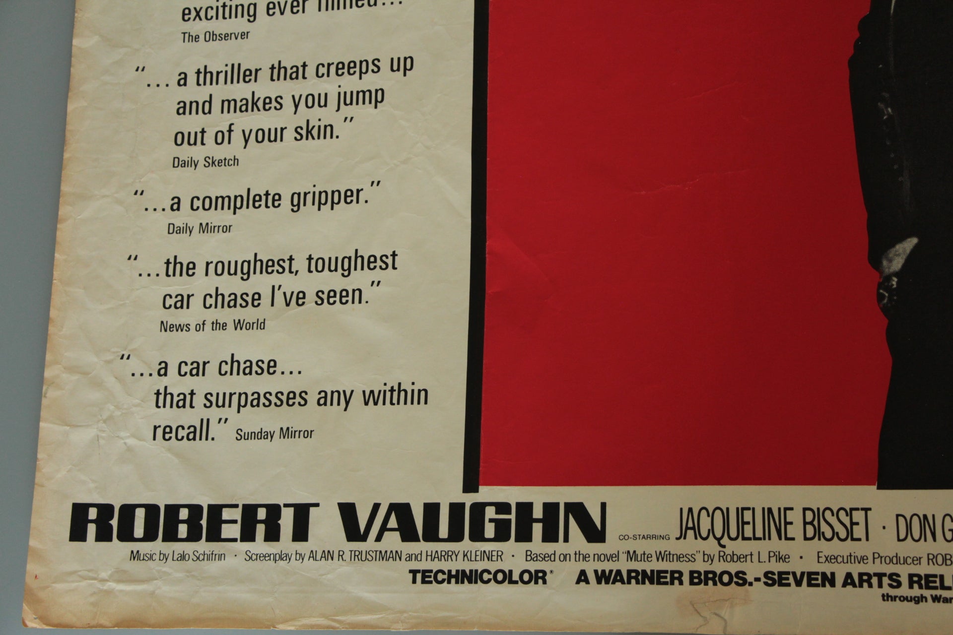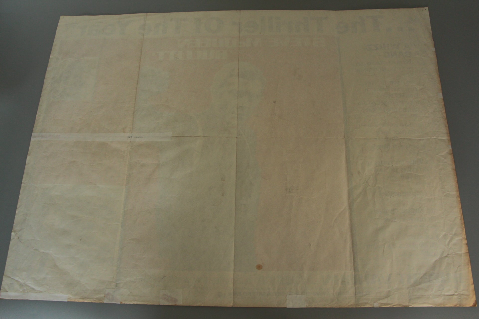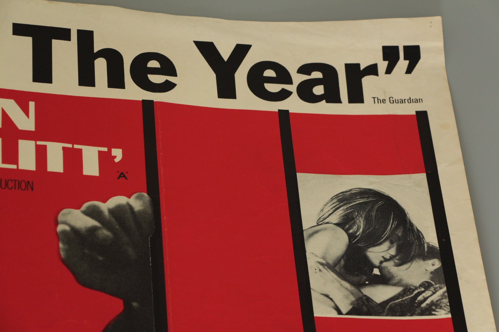 Extremely rare British quad film poster from the first release in 1968. Steve McQueen is pictured centrally as the maverick cop "Bullitt" together with two of the best photos from the film picturing a soirée with Jacqueline Bisset together with a scene from the famous San Francisco hill bouncing car chase. This is the Review style quad which has hardly ever turned up - we only know of one other one. The reviews make great reading and are from the British newspapers of the day including The Guardian, The Observer, The Daily Mirror, Sunday Express and more. "Bullitt" was the film which made Steve McQueen internationally famous and the pose here rates as one of his best. The colours on the film poster are very strong. The poster has two small pinholes at the top right and left corner with one each at the bottom corners. There is a tiny paper infill at the bottom border edge with a few tiny closed tears there. Across the centre fold line on the right hand side there has been a large 12 1/2 inch closed tear as seen which has been repaired to the reverse with a thin section of archival restoration tape. A film poster like this is a real piece of cinema history which is very rarely available and this one is fresh to the market.