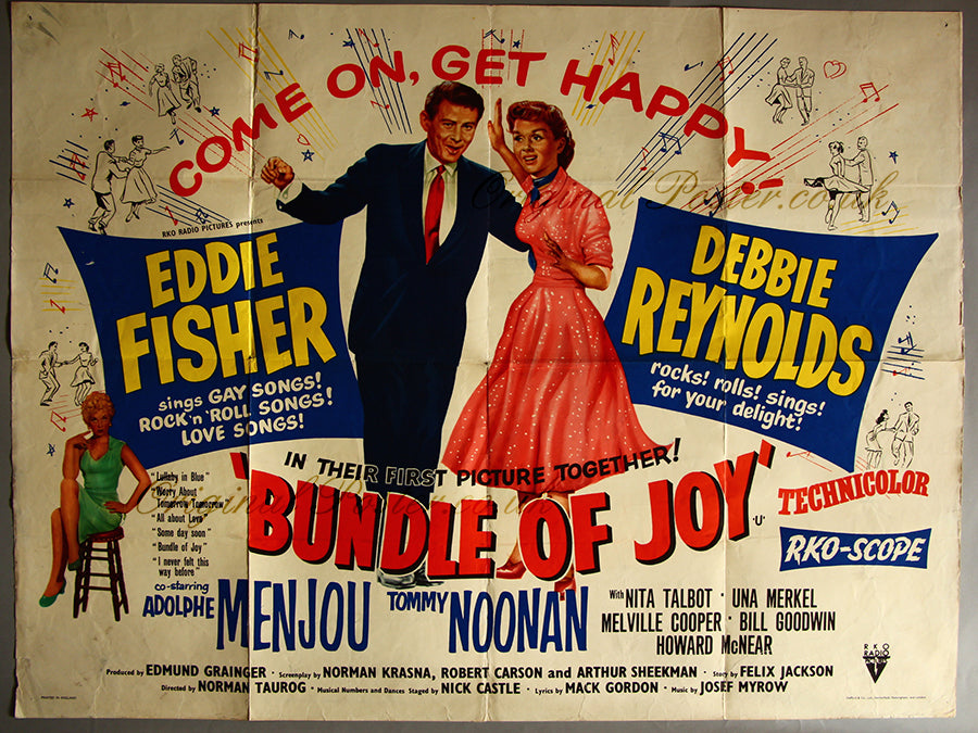 This is a real piece of pop culture from 1956, pictured centrally are Eddie Fisher - the King of the pop charts and his new bride - Debbie Reynolds in their first role together. Stylistic pen and ink line drawings and crocthets and quavers plus two love hearts add to the happy picture.