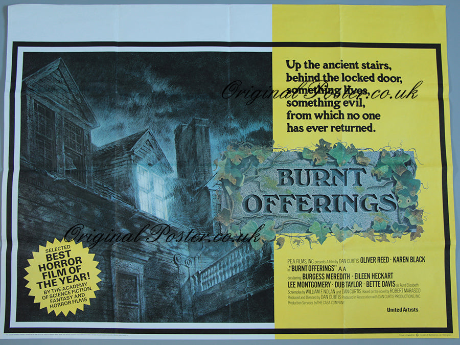 Amityville style horror starring Oliver Reed and Bette Davis with printing by Lonsdale & Bartholomew Ltd of Nottingham. Folded film poster from 1976.