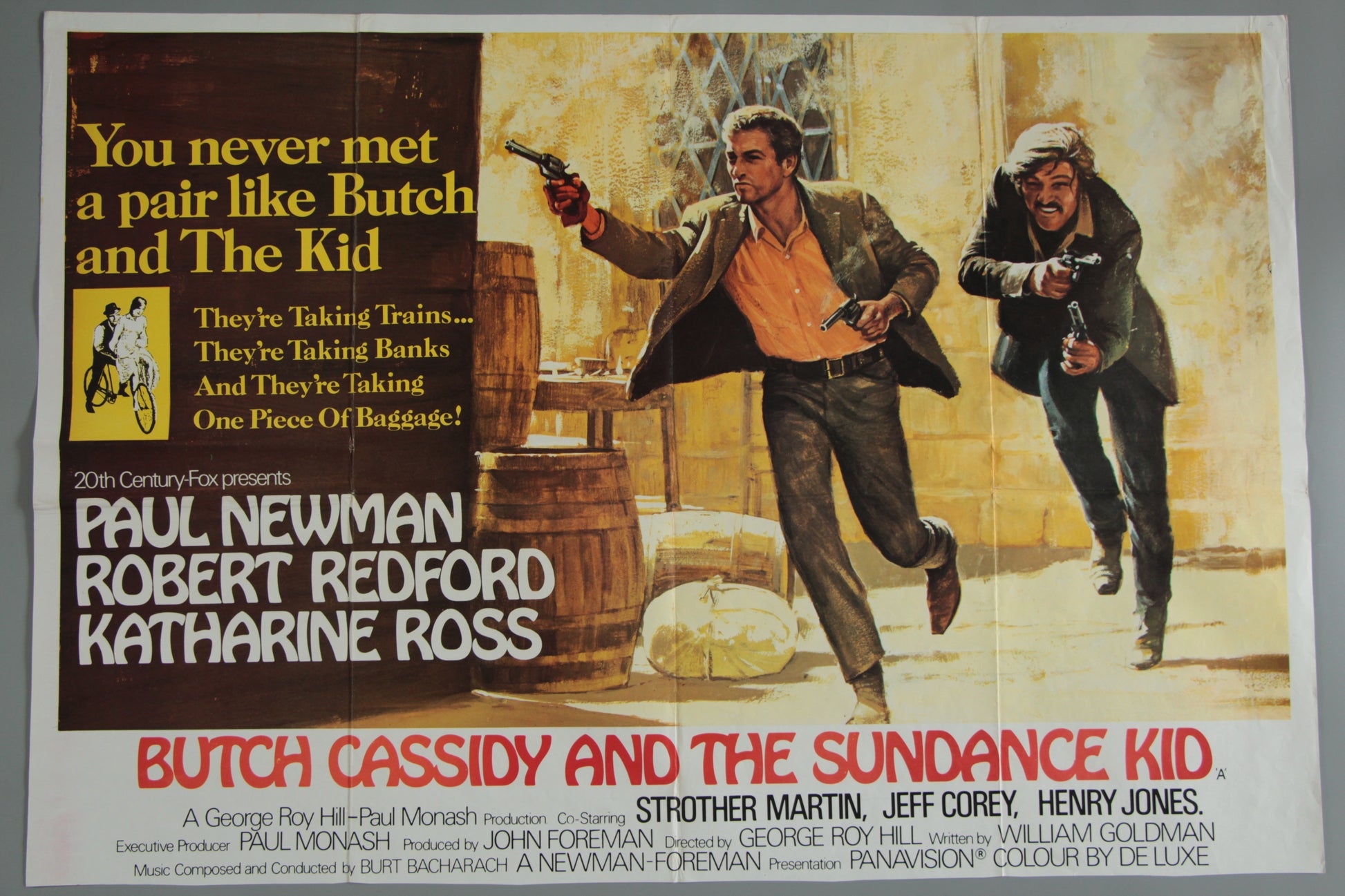 Perhaps the most successful Western of all time and certainly two of the most loveable rogues pictured here with Paul Newman as Butch Cassidy together with partner Robert Redford as The Sundance Kid. Printed in England by Lonsdale & Bartholomew of Nottingham this is a true piece of cinema history. The film poster is truly atmospheric with great use of colour picturing the final scene of the shoot-out in this classic western. The title typography and tag lines are superb and there is even a great inset picture of the bicycle scene which featured the memorable music by Burt Bacharach "Raindrops keep falling on my head". The bottom section of the film poster which was largely just white has been trimmed by 2 1/2 inches. Folded British quad from the first release in 1969 in very clean condition and with great colours.