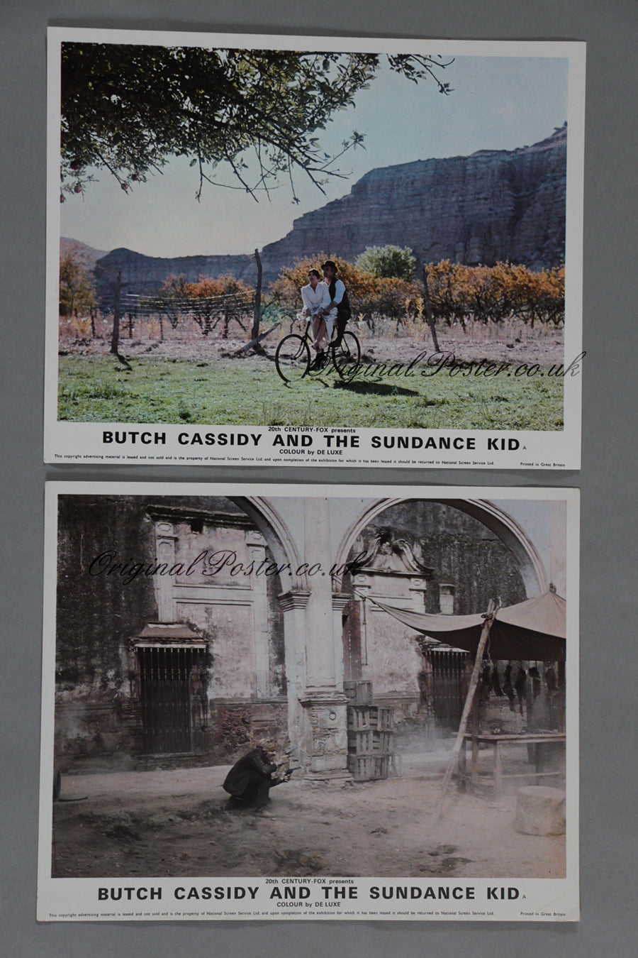 Two classic scenes in these British front of house cinema lobby cards from 1969. Robert Redford "The Sundance Kid" is seen taking on the whole world in the final clip whilst his buddy Paul Newman as "Butch Cassidy" is seen in happier times with Katharine Ross to the tune of "Raindrops Keep Falling on my Head"