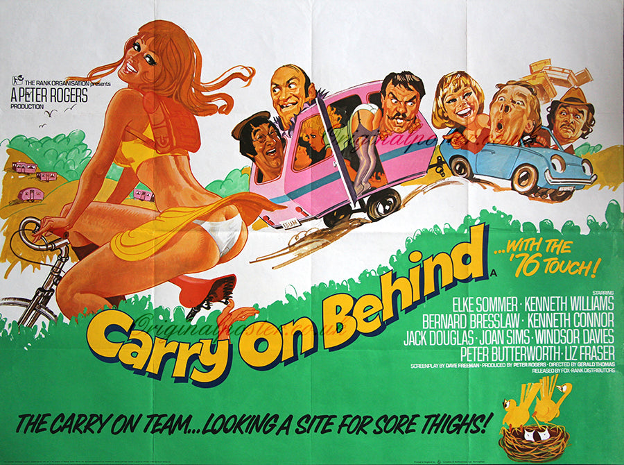 This wonderfully funny, sexy artwork heralds from the Italian poster artist Arnaldo Putzu. Comic detail includes the registration on the caravan "13UM" and the bird's nest and the hand extending towards the bum from the title. The Carry On Camping theme is extended to that new British fad - "the caravan". Wonderfully British as were all the Carry On films. Printed in England by Lonsdale & Bartholomew of Nottingham.