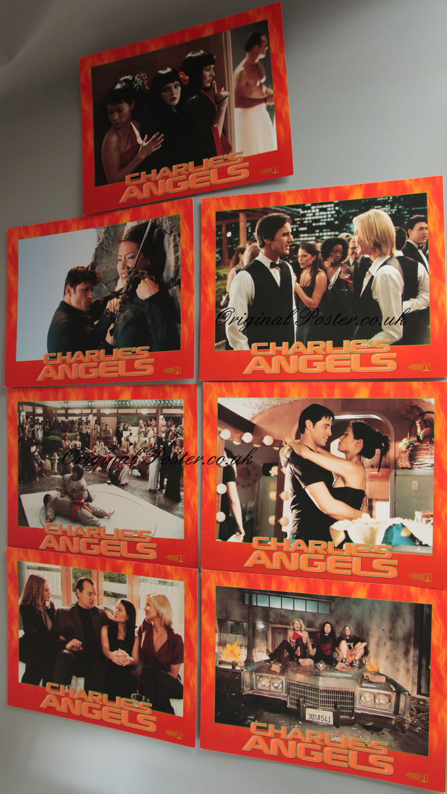 Seven original lobby cards for "Charlie's Angels" picturing Cameron Diaz, Drew Barrymore and Lucy Liu as the detectives with a mysterious boss. The cards are in excellent condition with no pinholes.