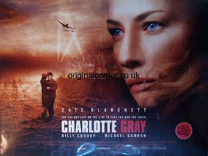 We find ourselves drawn toward the blue eyes of Cate Blanchett who stars as the Scottish wartime agent parachuting into occupied France in search of her missing lover and pilot. Folded and rolled double-sided poster with dimples and velcro stickers on reverse from the Midlands Arts Cinema.