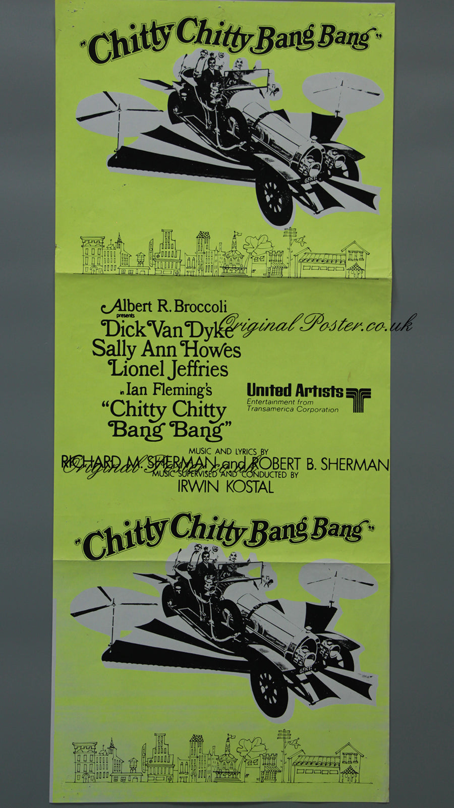 The Edwardian car "Chitty Chitty Bang Bang" was a great success in 1968 and has continued to be a really popular film for all the family. The car is pictured on this film poster with Dick Van Dyke and Sally Ann Howes flying through the air. The film has a great pedigree coming from the pen of Bond author Ian Fleming and produced by Cubby Broccoli. This poster is folded as issued to the cinema and has pinholes in the corners.